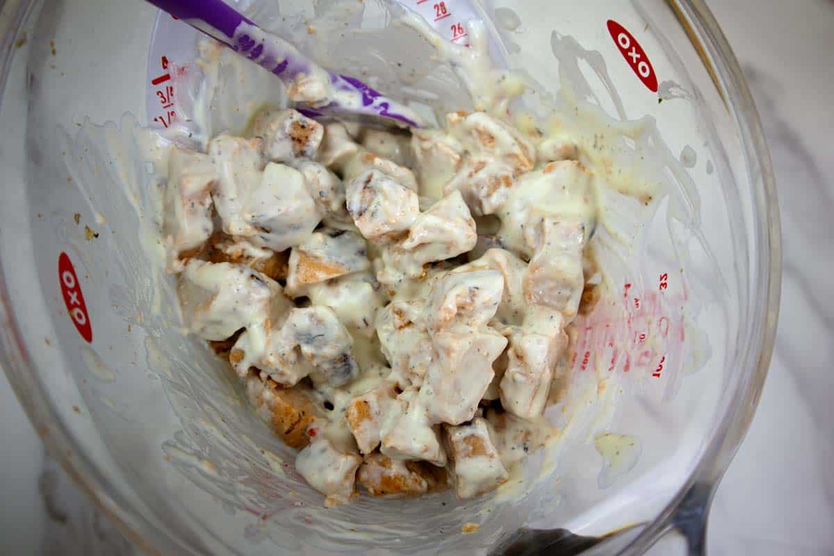 - In a small bowl, combine the cooked chicken with ½ cup ranch dressing.