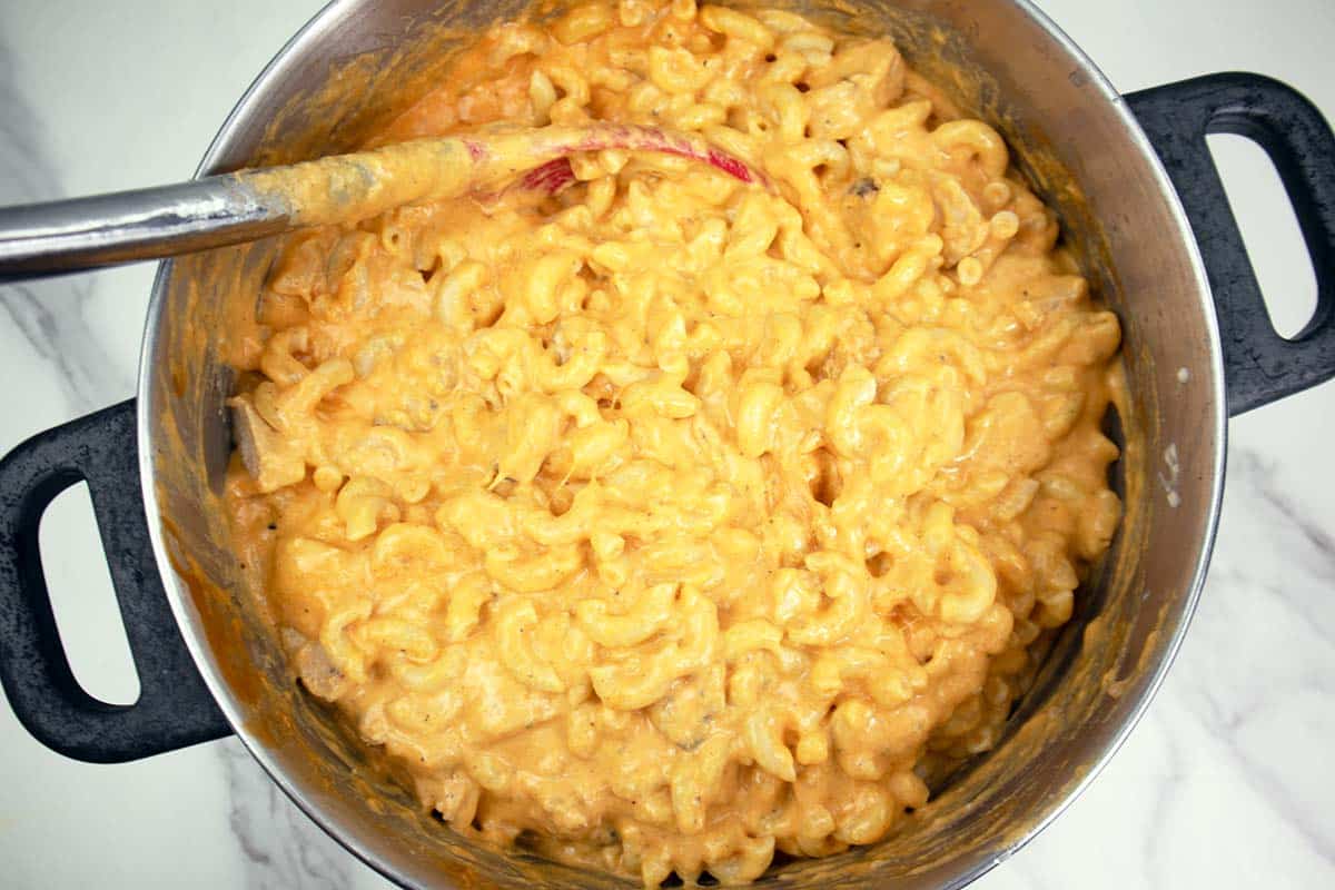 - Add the cooked pasta into the sauce and stir until everything is coated.