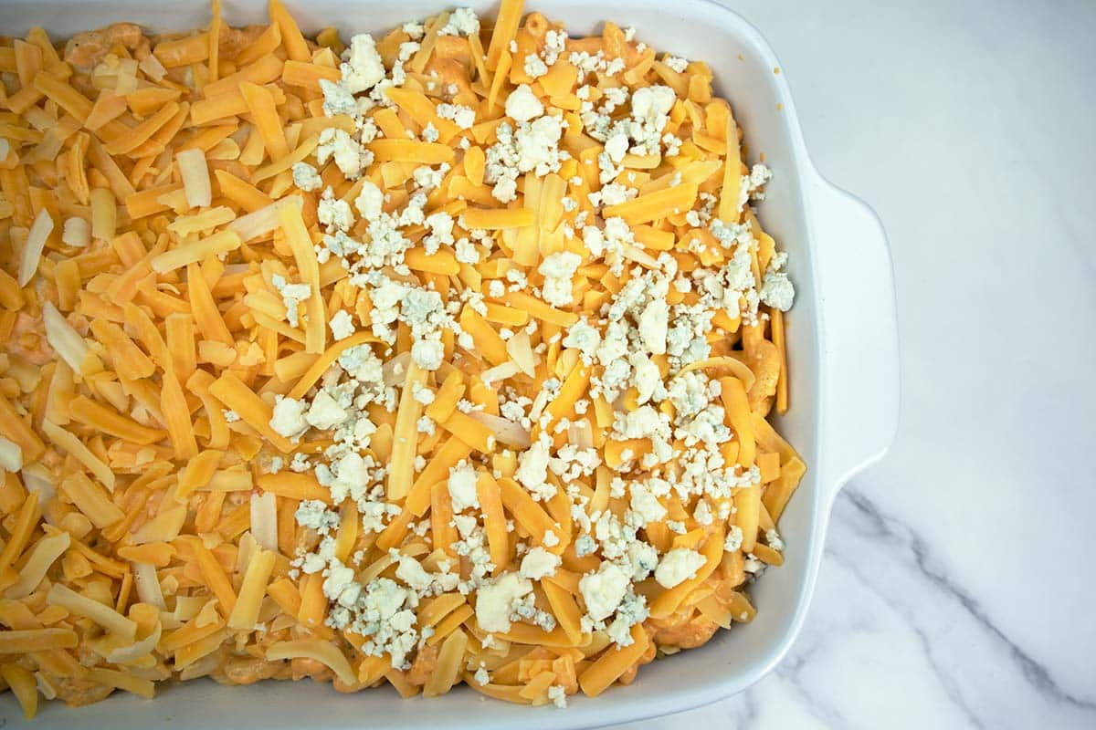 - Pour into a greased 9x13" baking dish. Top with the remaining 1 cup cheese, plus the blue cheese crumbles.