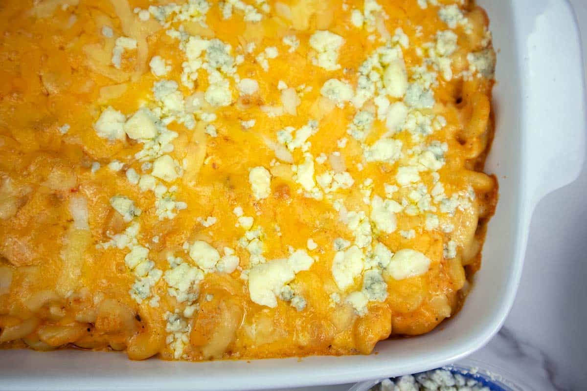 - Pour into a greased 9x13" baking dish. Top with the remaining 1 cup cheese, plus the blue cheese crumbles. (One person in my family is not a fan of blue cheese, so it is only on half of the casserole.)