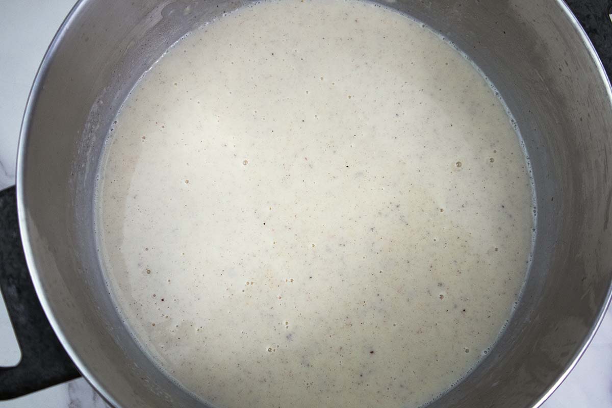 - In a large heavy-bottomed pot, melt the butter over medium heat. Once the butter has melted, whisk in the flour until combined. Cook over medium heat, stirring frequently, for 1–2 minutes to eliminate the raw flour taste. Season with salt and pepper.