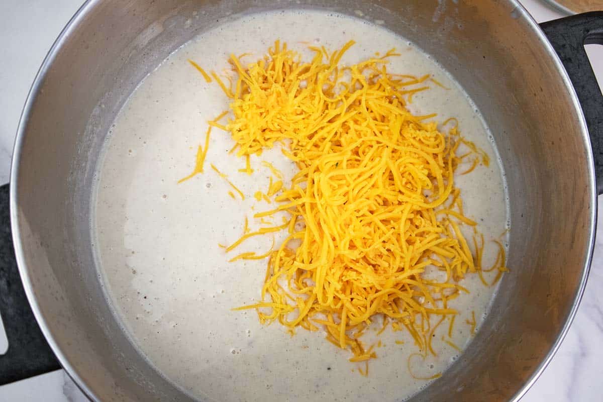 - Slowly whisk in milk until smooth. Cook until slightly thickened. Stir in 3 cups of shredded cheese. Mix until melted and creamy.