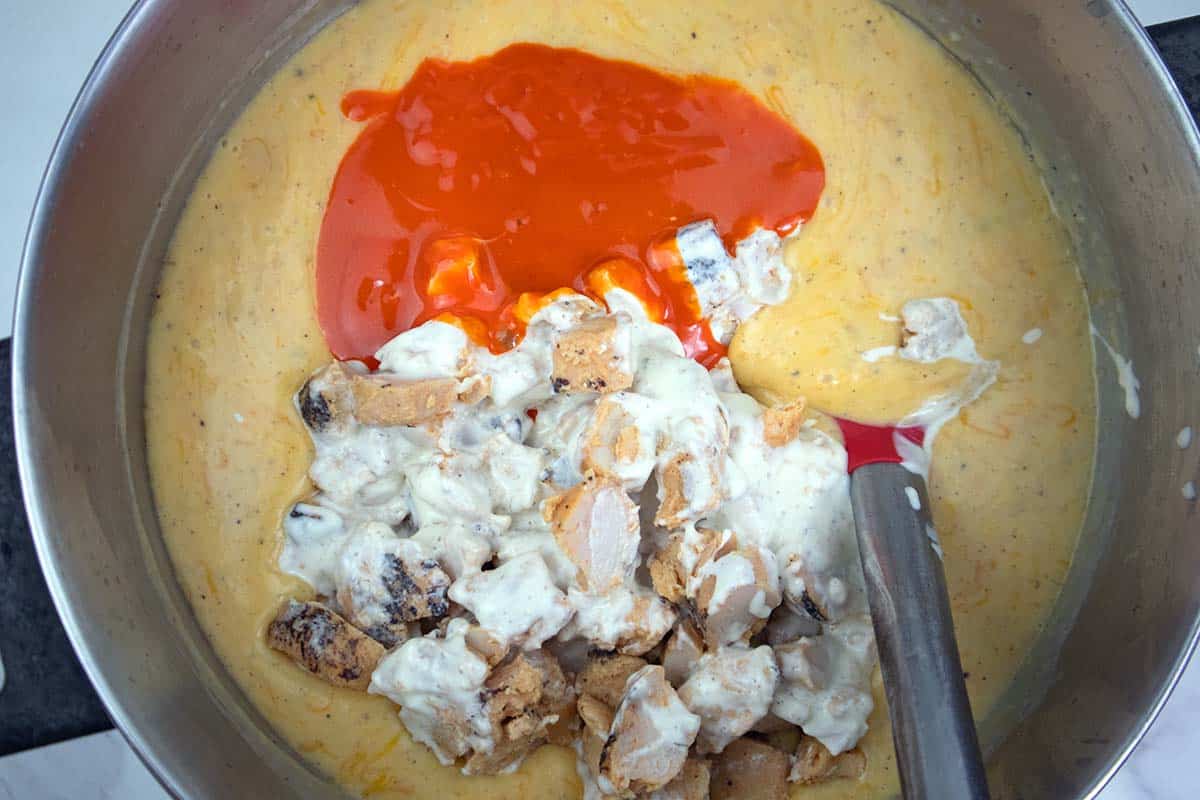 - Stir in buffalo sauce and cooked chicken. Taste and adjust spice level by adding more buffalo sauce if desired.
