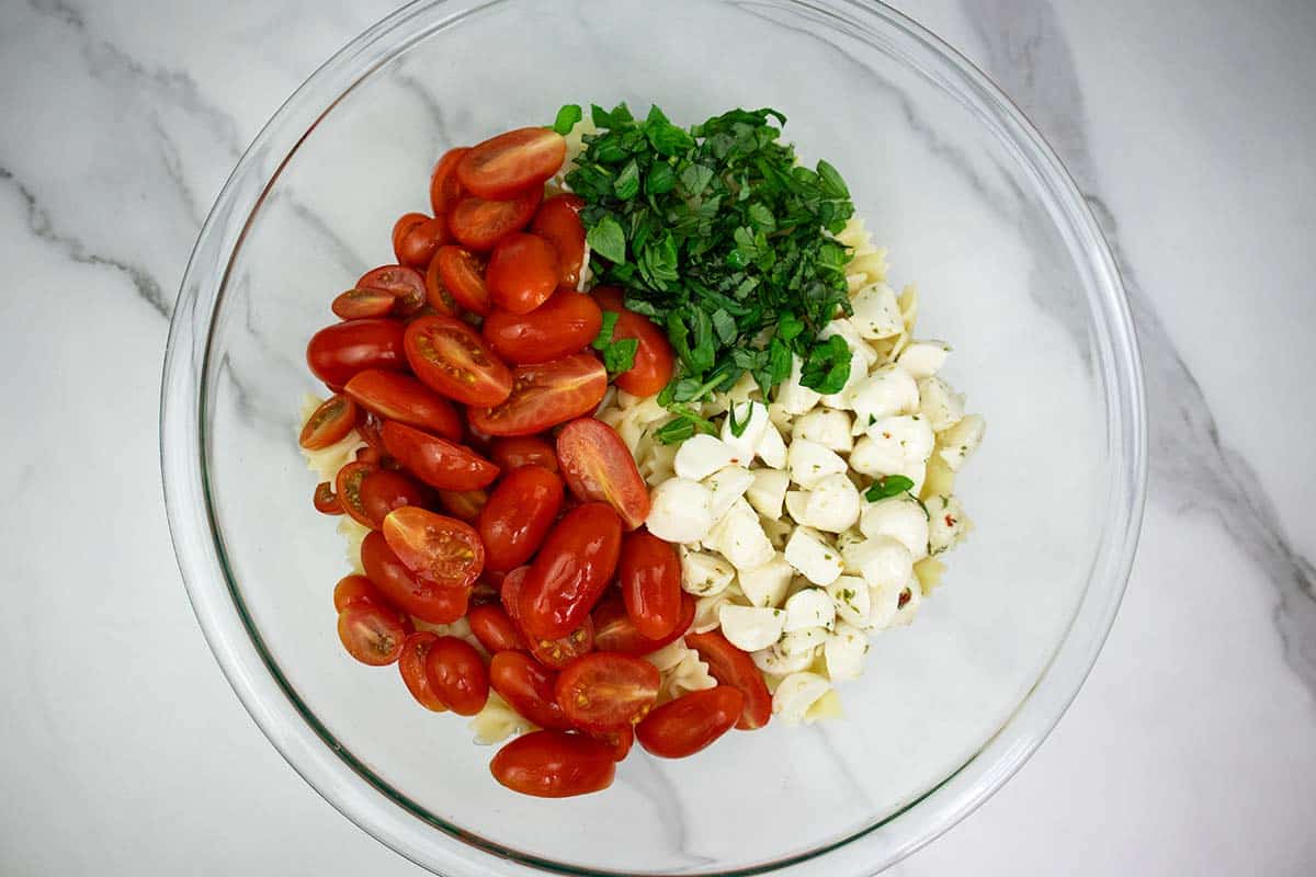 - In a large bowl, combine pasta, tomatoes, half of the basil, and mozzarella pearls.