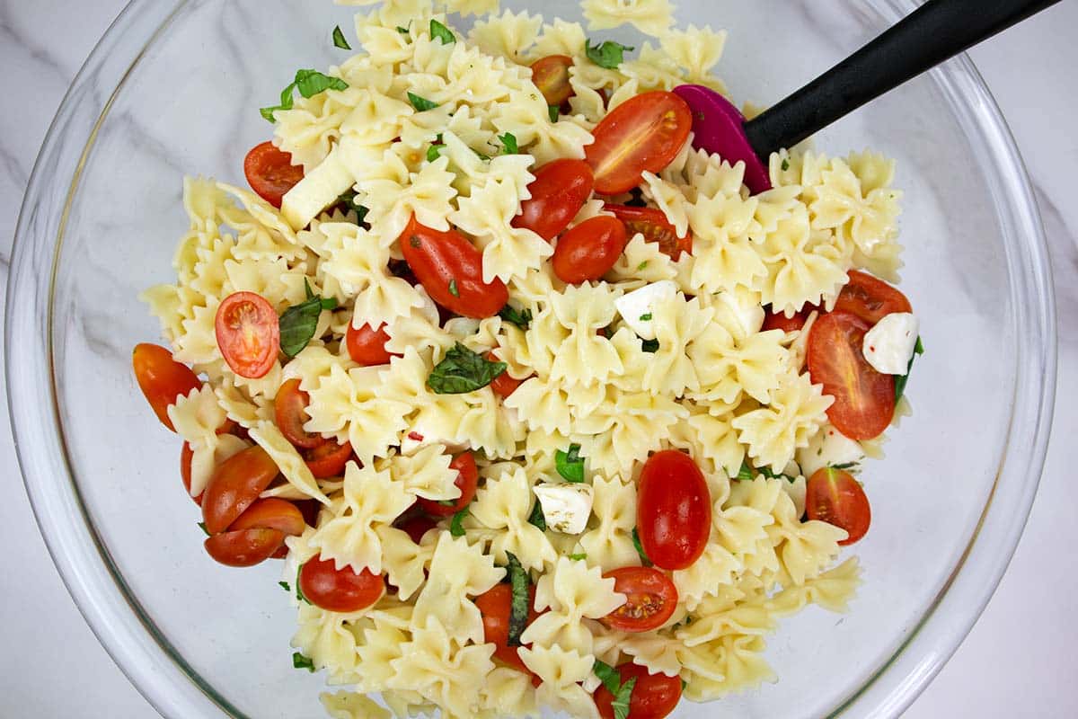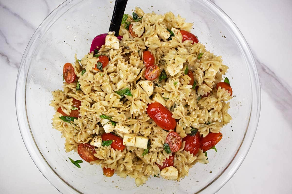 - Pour the dressing over the pasta salad and toss gently until evenly coated. If you are not serving right away, reserve some of the dressing.