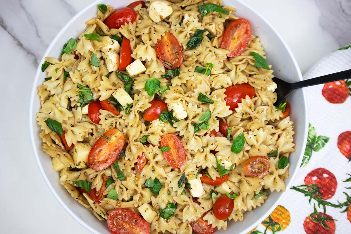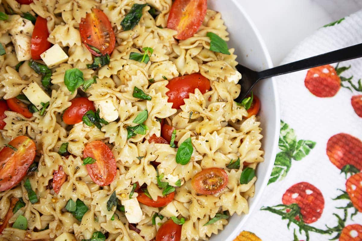 - Cool your pasta completely before mixing it with the other ingredients—warm pasta can melt the mozzarella and wilt the basil in a sad way.