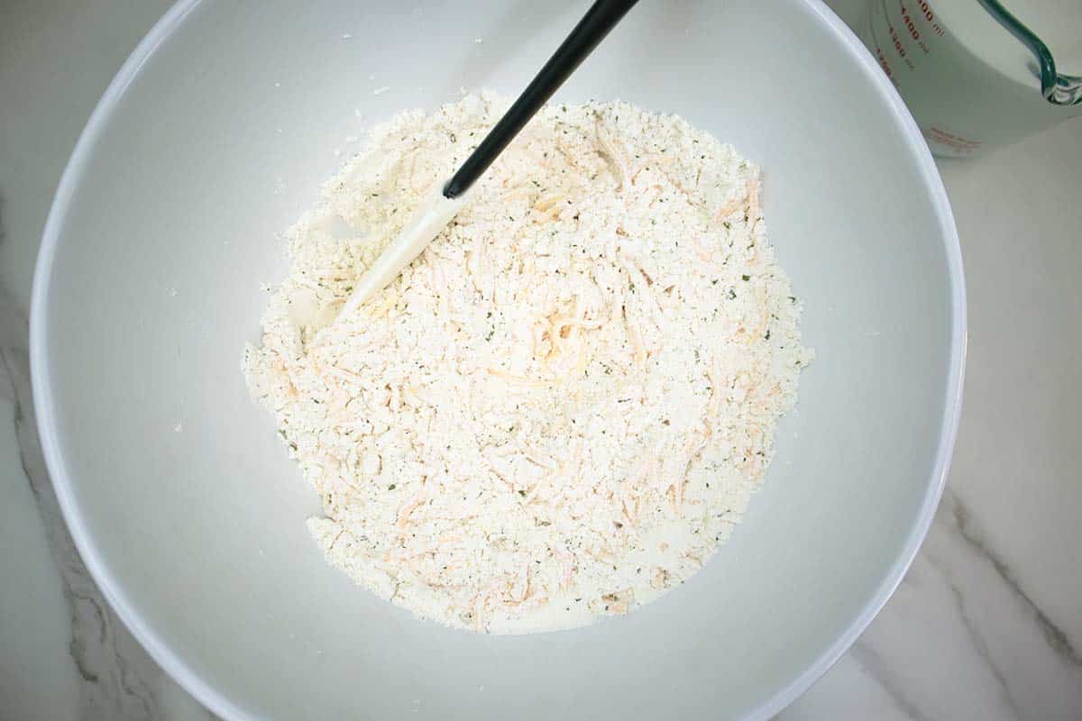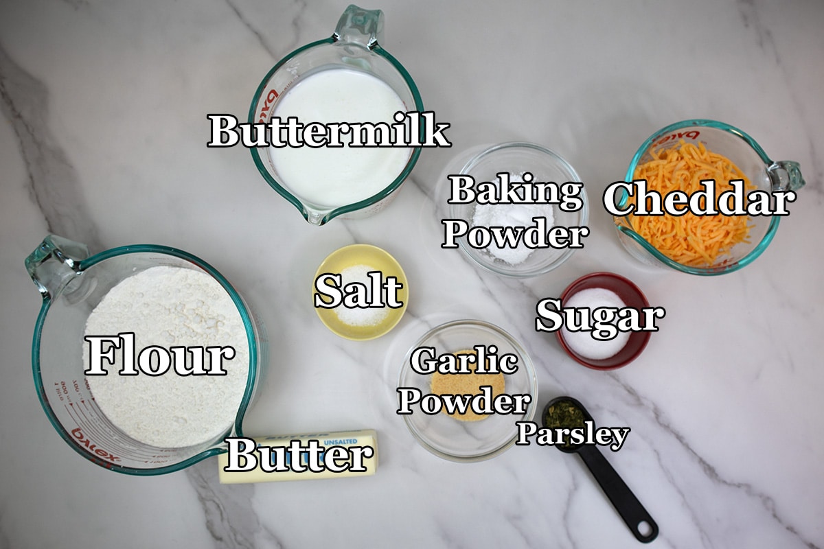 - In a large bowl, whisk together flour, baking powder, sugar, salt, garlic powder and parsley. Gently fold in the shredded cheddar cheese.