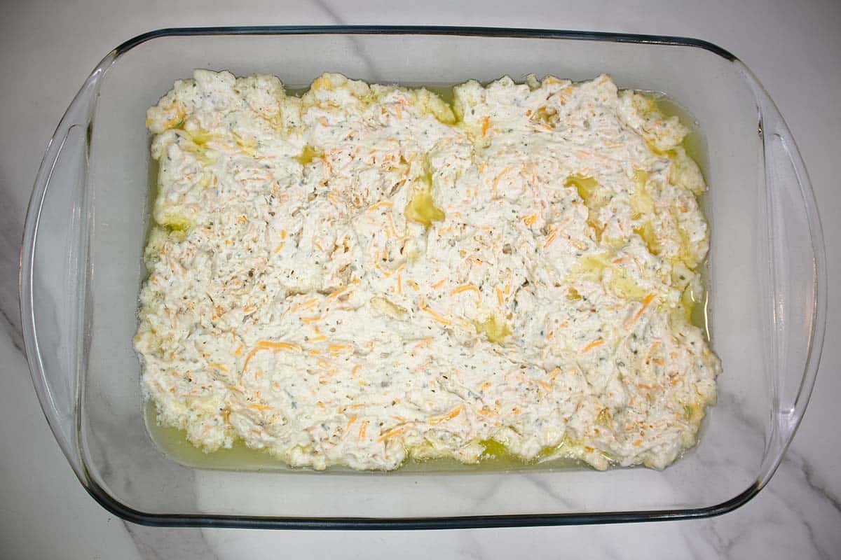 - Place biscuit dough right on top pf the melted butter and spread to cover the baking dish, as much as possible. It is okay to have the butter run over the top of the dough.