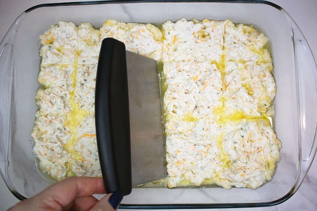 - Using a knife or bench scraper, cut the dough into squares. (12-15 for 9x13" pan and 9 squares for an 8x8 or 9x9")