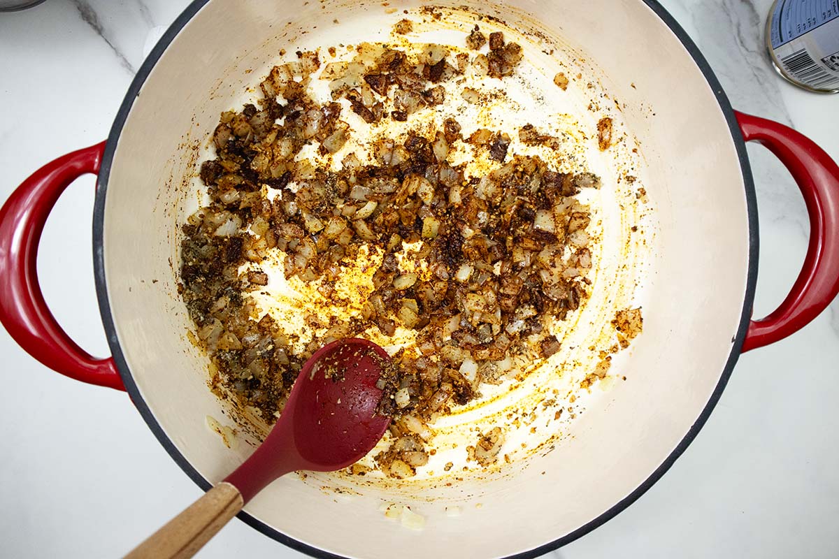 - Stir in chili powder, oregano, black pepper, and salt. Cook about 30 seconds.