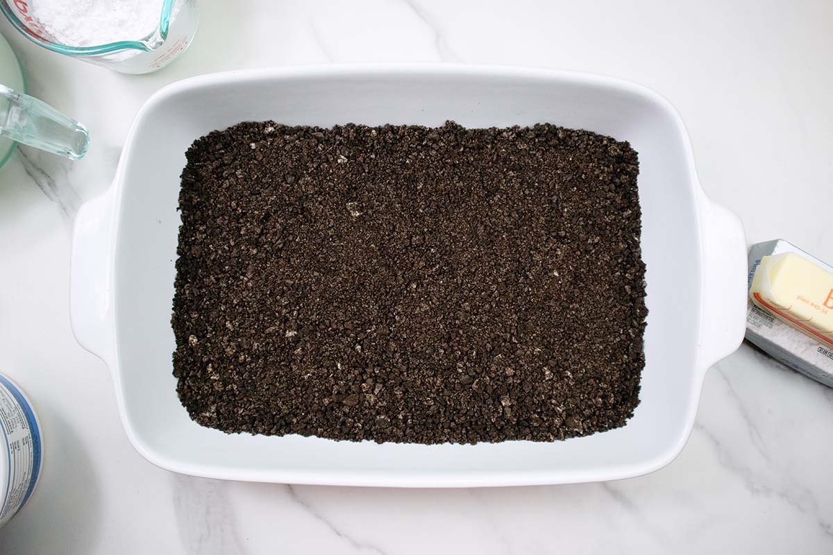 - Spread about ⅔ of the Oreo crumbs into an even layer in the bottom of a 9x13-inch pan. Set aside the remaining crumbs for the “dirt” topping. Refrigerate the crust while you prepare the filling.