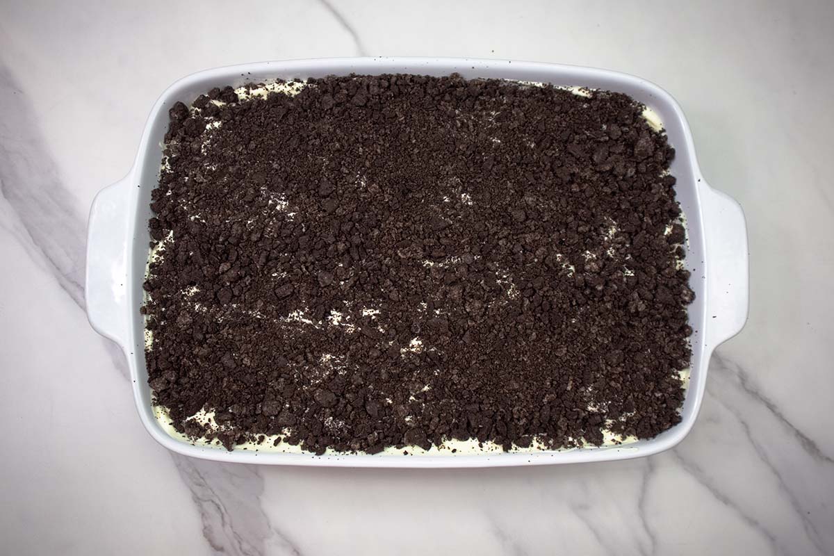 - Spread the rest of the cookie crumbs over top, creating that "dirt" layer. Sprinkle the rest of the crushed cookies on top.