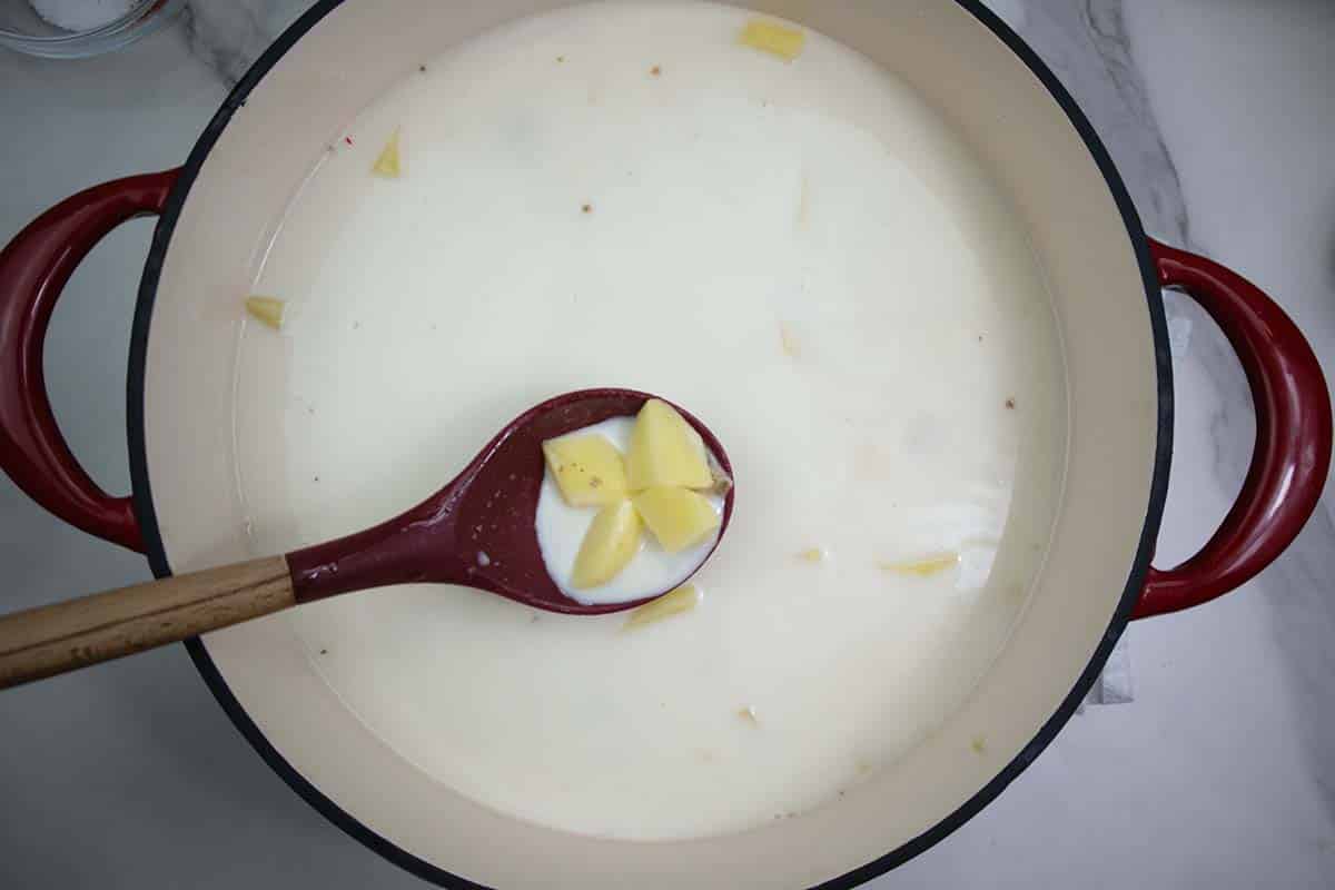- Bring to a boil, then lower temperature to medium, cooking until potatoes are fork tender. About 12–15 minutes.