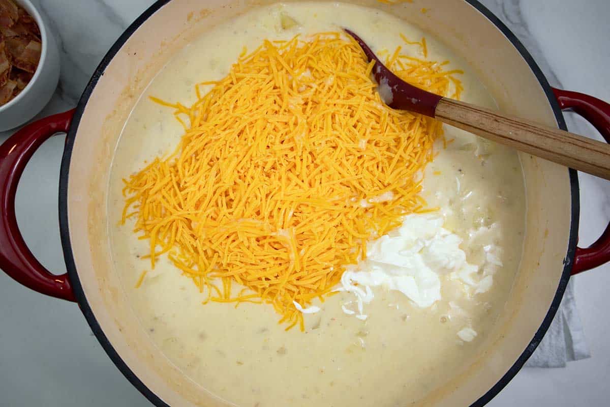 - Mix in cheddar cheese, cooked bacon, and sour cream.